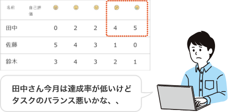 チームリーダーは、各メンバーからの日報に対して、やるべきこととやったことのギャップを確認し、簡単に評価することができます。